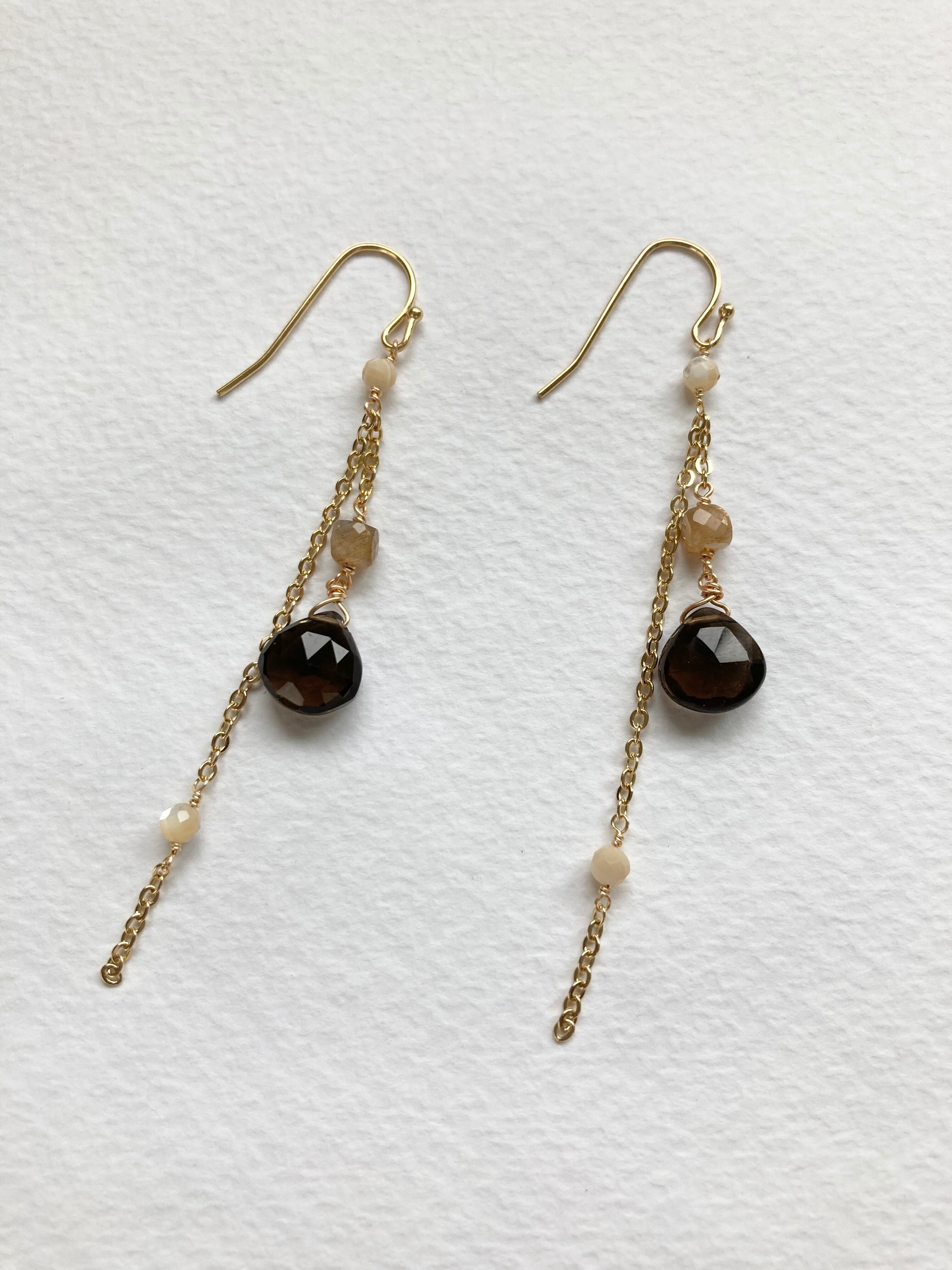 スモーキークォーツにチョコレートムーンストーンとマザーオブパールを合わせたシックな大人カラーのピアス