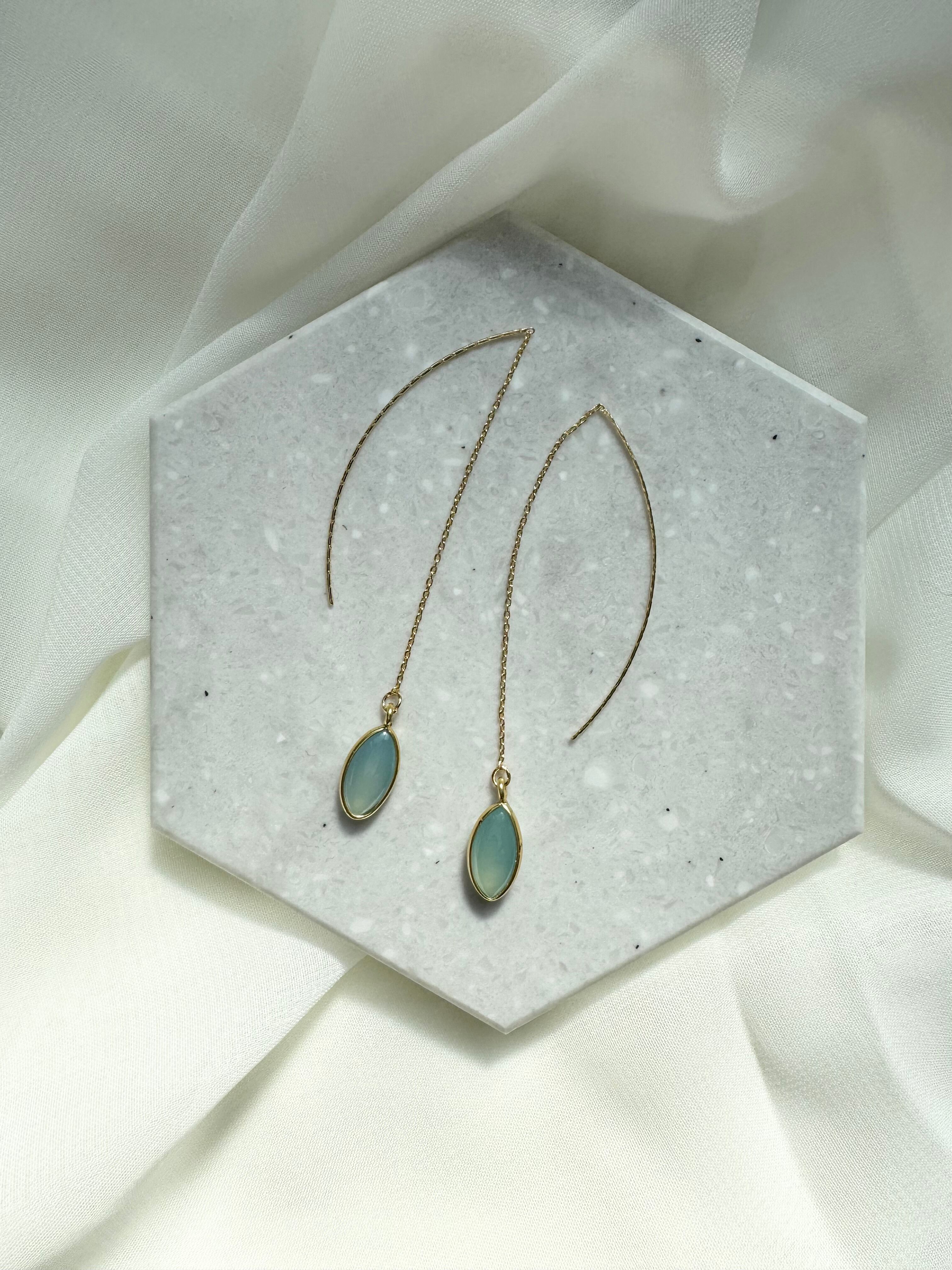 ぷっくりとしたマーキス型のブルーカルサイトに繊細なチェーンと弓形のポストを合わせたアメリカンピアス